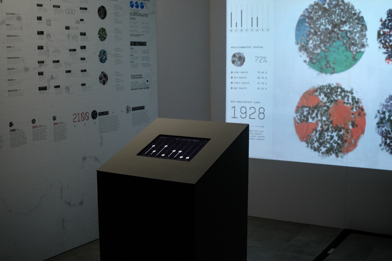 The project itself is grounded in environmental and ecological research, combining sources such as the IPCC, Our World in Data, and the Planetary Boundaries framework. This data informed both the installation’s visual language and the design of a companion infographic wall, providing context and scale to the interactive experience.